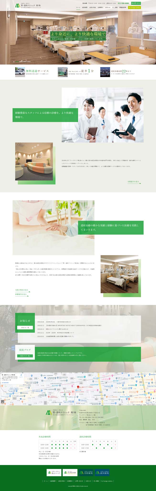 腎・透析クリニック 南1条 様 URL 概要 宮の森記念病院様(https://www.miyanomori.or.jp/)のサテライトクリニックとして、デザインコンセプトを踏襲し一般の患者さまが利用しやすいUXデザインを設計。 親サイト同様、基本的なSEO内部施策のほか、MEOに対しても基本対策を施行し流入拡大。CMSも導入し保守運用はクライアント様で完全管理を行っております。 (CMS/UX/SEO/MEO/スマホ対応/レスポンシブ) < 前の導入事例へ 一覧に戻る 次の導入事例へ >